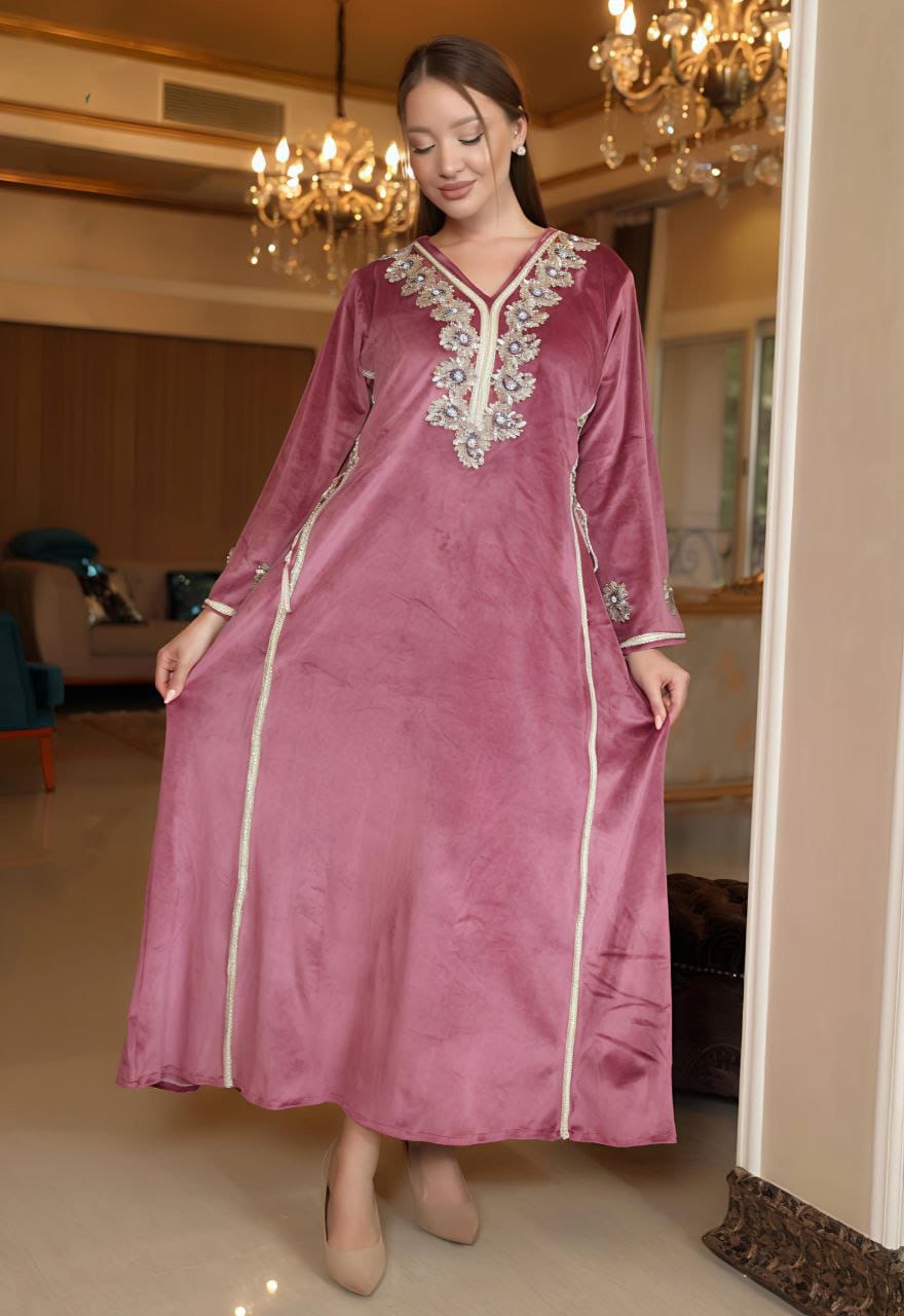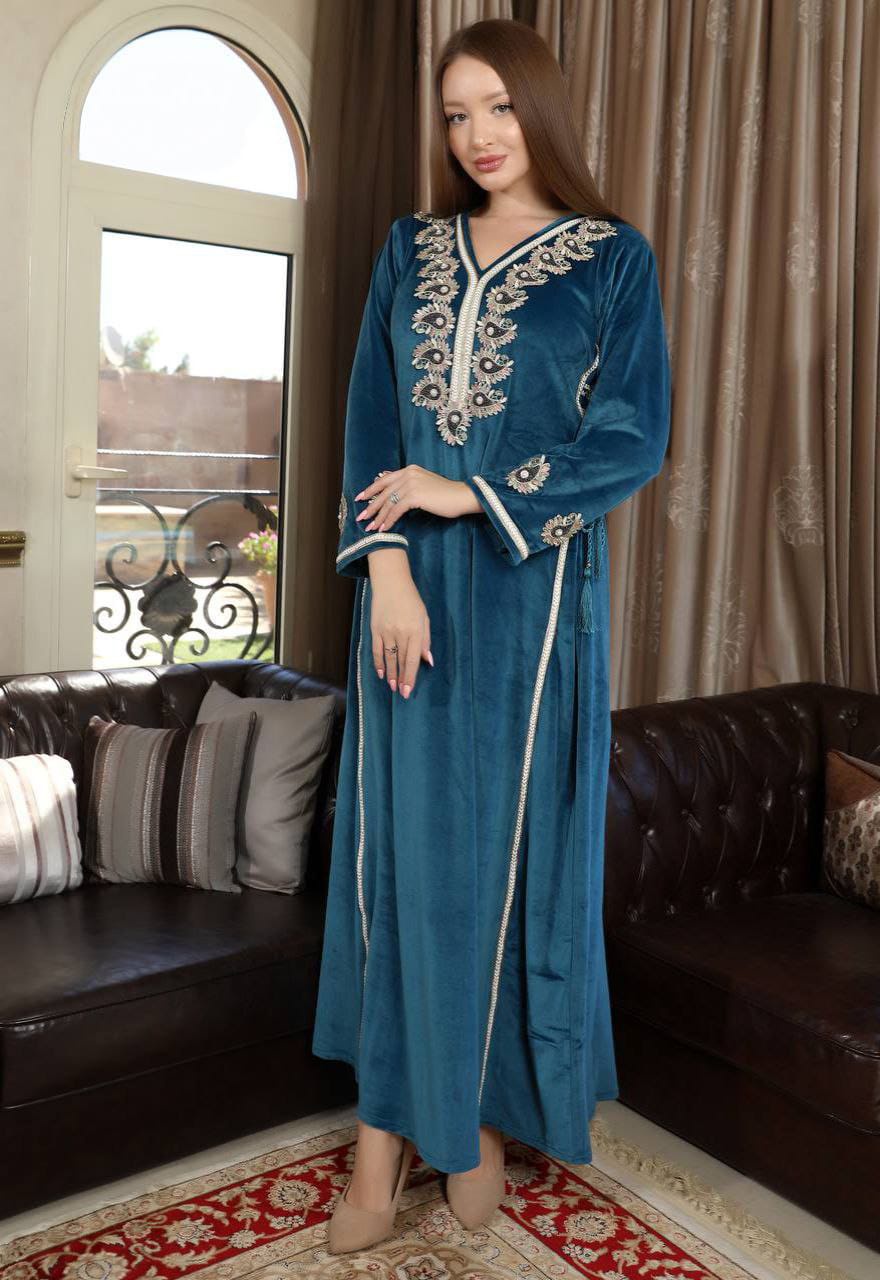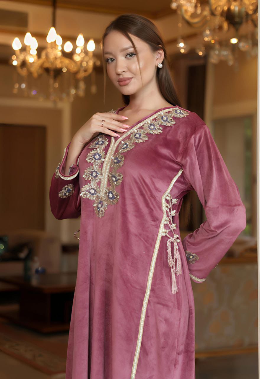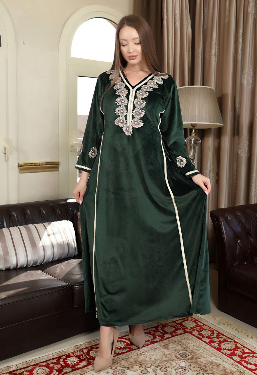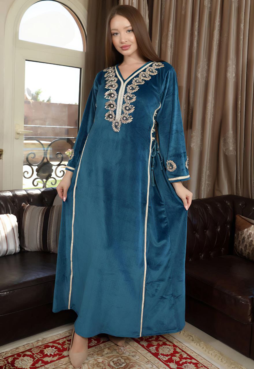 عباية قطيفة من روزا خامة مستوردة ثقيلة ودافئة. تتميز بـ تطريز كثيف وراقي على الصدر والأكمام، مع أحزمة جانبية تمنح العباية قصة نحيفة ومميزة. مثالية لـ الاستقبال والأناقة المحتشمة في الشتاء.