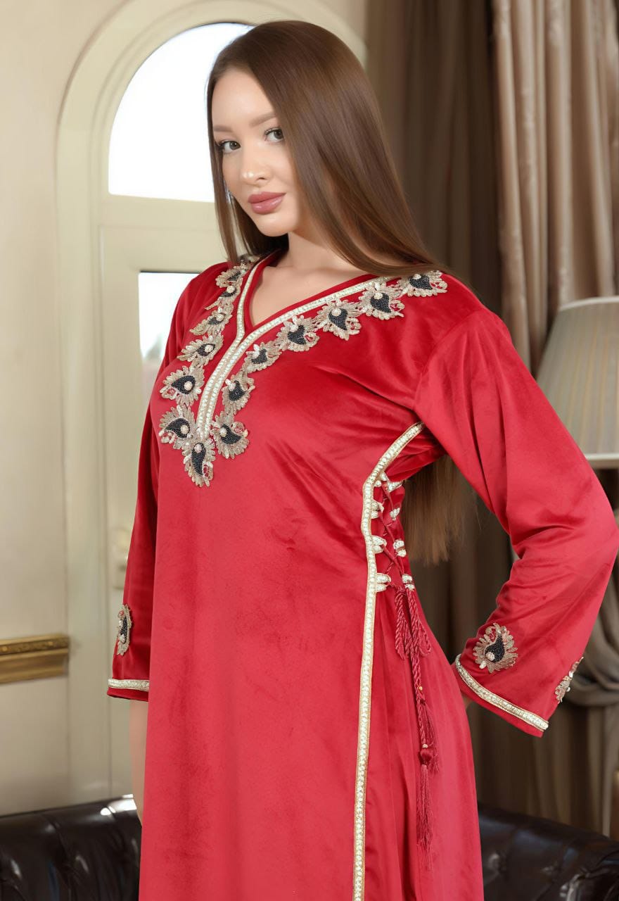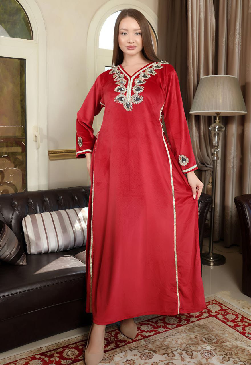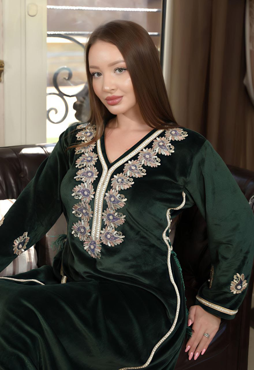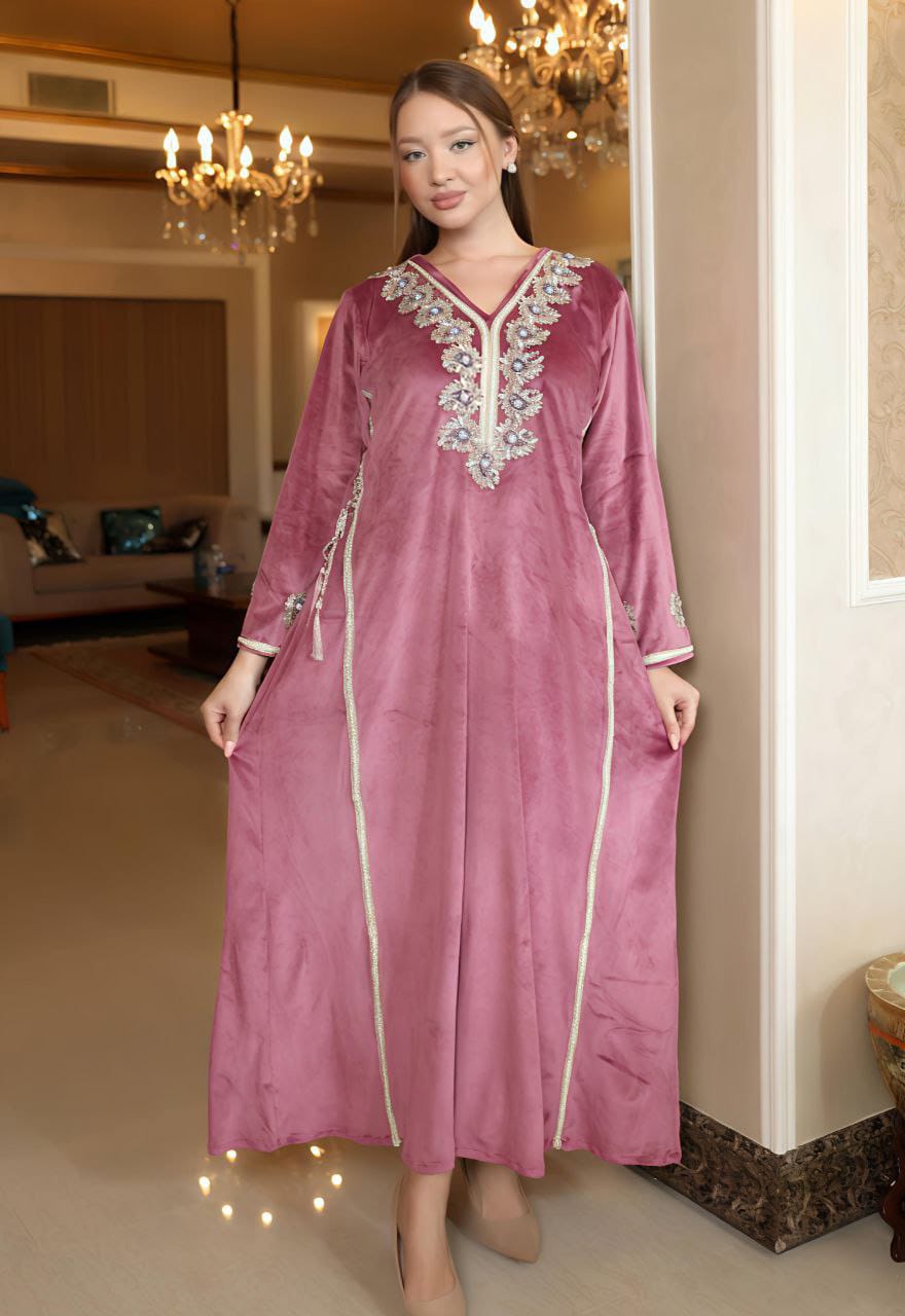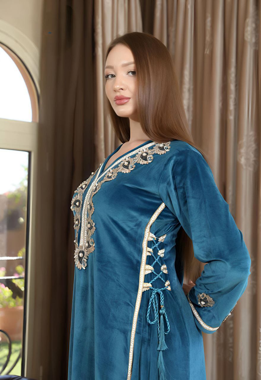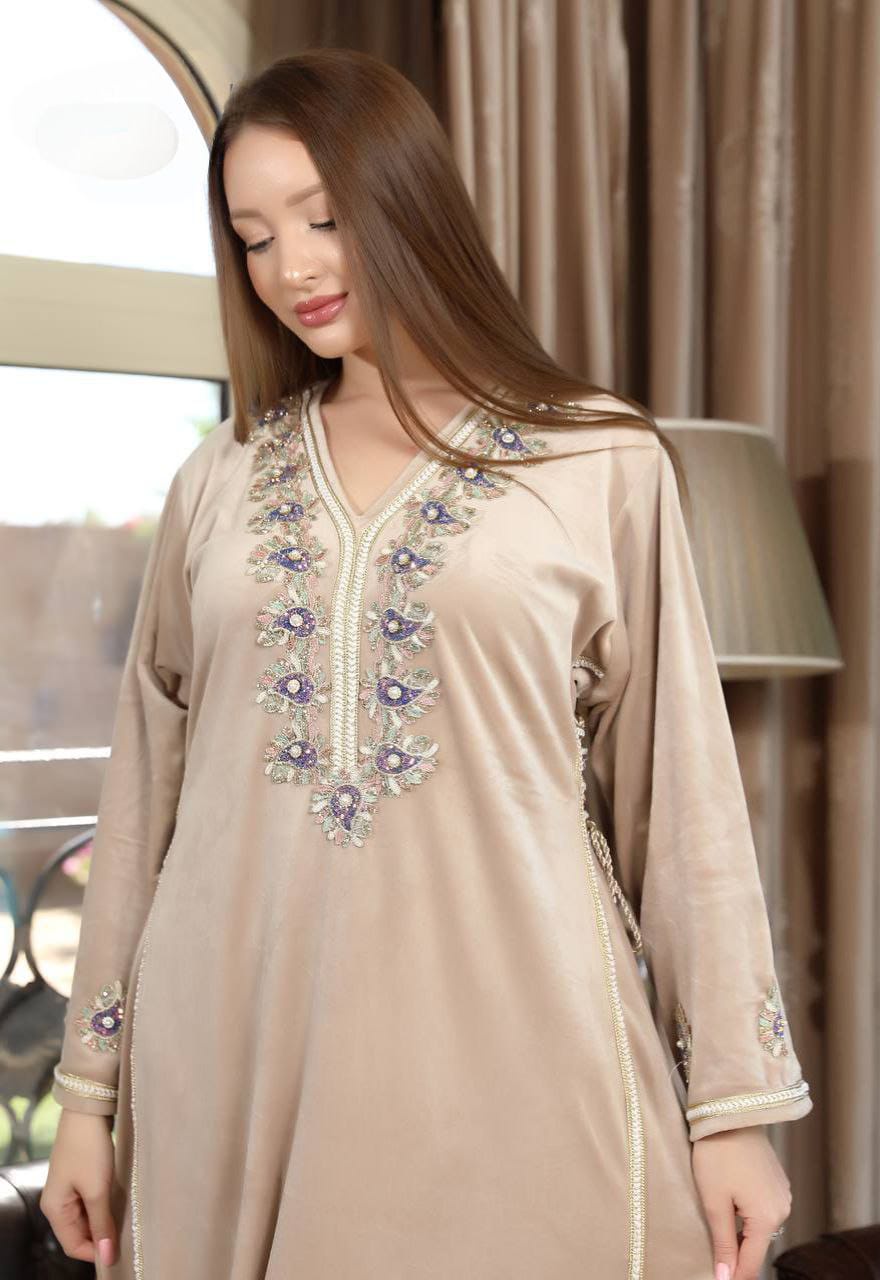 عباية قطيفة من روزا خامة مستوردة ثقيلة ودافئة. تتميز بـ تطريز كثيف وراقي على الصدر والأكمام، مع أحزمة جانبية تمنح العباية قصة نحيفة ومميزة. مثالية لـ الاستقبال والأناقة المحتشمة في الشتاء.