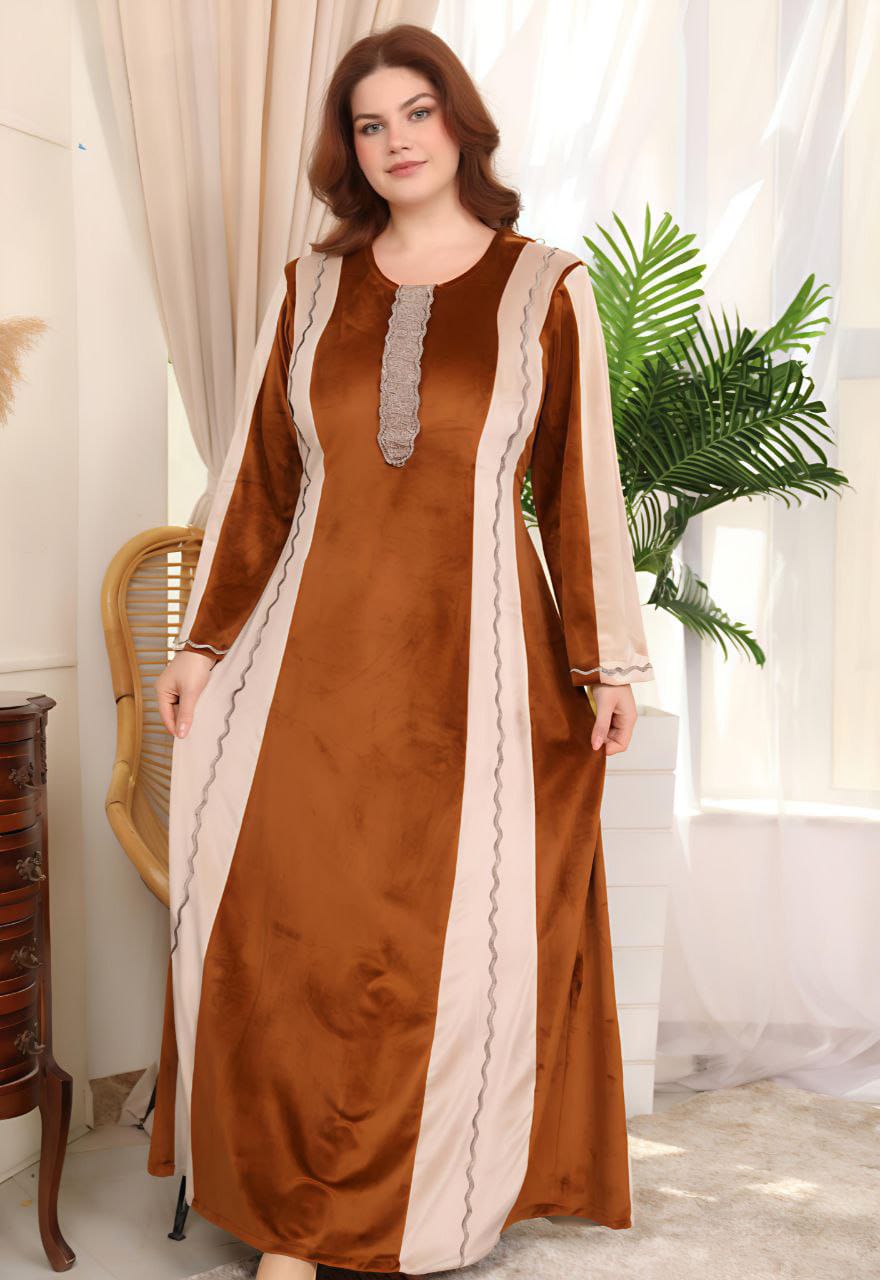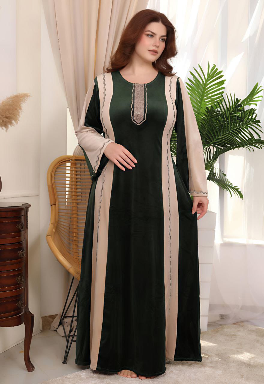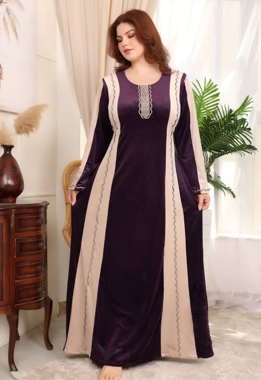 جلابية/عباية من القطيفة الثقيلة والدافئة. تتميز بـ تطريز خفيف وراقي، مع أحزمة جانبية متطابقة تمنح العباية قصة نحيفة ومميزة.