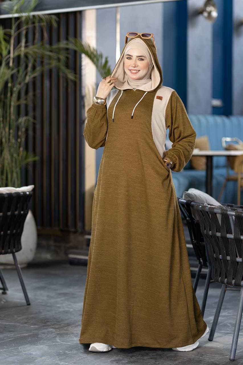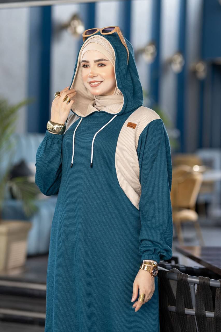 دريس كاجوال شتوي طويل، يوفر دفئًا مثاليًا بفضل خامة الريب المضلّع الثقيلة. يتميز بـ كابشو (غطاء رأس) عملي وبقصة "لون × لون" جذابة ومناسبة للمحجبات